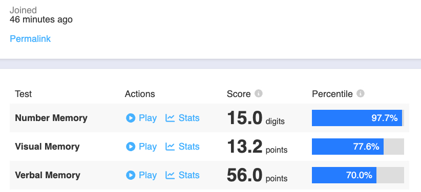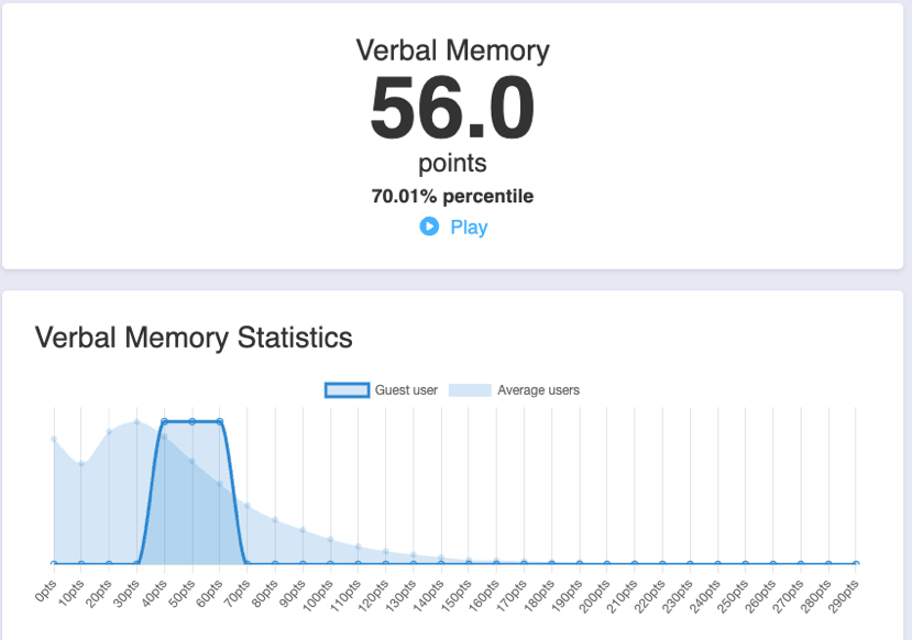 不过 这些记忆测试下来 似乎也符合基因测试结果 比如测的数字记忆是中 但测试结果看我数字记忆好于97%的人群… 言语记忆因为测试的是英文(尽管英语是我第二语言,但肯定弱于母语)稍微低一点