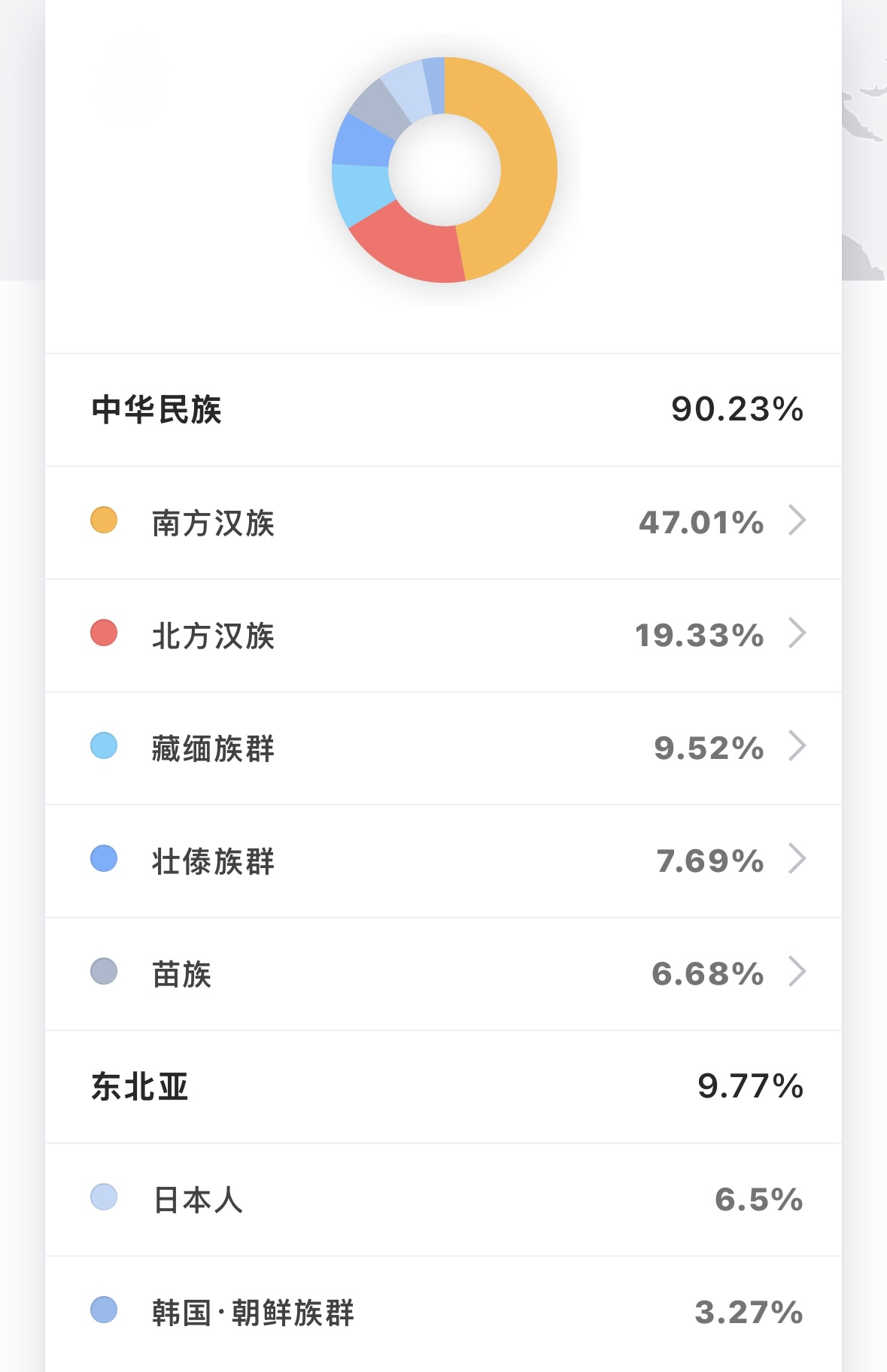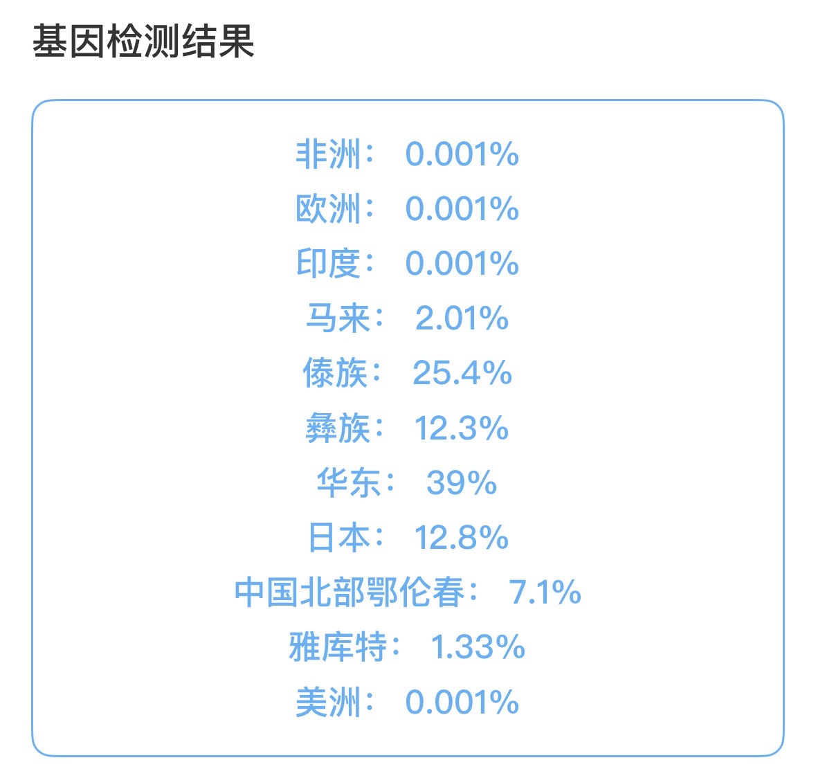 {"result":[{"race_desc":"\u4e2d\u534e\u6c11\u65cf","race_en":"chinese_nation","race_probality":"0.758964","area":[{"block":"chinese_nation","race_desc":"\u5357\u65b9\u6c49\u65cf","race_en":"han_southern","race_probality":"0.589427"},{"block":"chinese_nation","race_desc":"\u7572\u65cf","race_en":"she","race_probality":"0.053273"},{"block":"chinese_nation","race_desc":"\u85cf\u65cf","race_en":"tibetan","race_probality":"0.044129"},{"block":"chinese_nation","race_desc":"\u7eb3\u897f\/\u5f5d\u65cf","race_en":"ny","race_probality":"0.033251"},{"block":"chinese_nation","race_desc":"\u82d7\u7476\u8bed\u65cf\u7fa4","race_en":"miao_yao","race_probality":"0.019754"},{"block":"chinese_nation","race_desc":"\u62c9\u795c\u65cf","race_en":"lahu","race_probality":"0.019070"},{"block":"chinese_nation","race_desc":"\u5176\u4ed6","race_en":"other","race_probality":"0.0003"}]},{"race_desc":"\u4e1c\u5317\u4e9a","race_en":"ne_asian","race_probality":"0.203512","area":[{"block":"ne_asian","race_desc":"\u65e5\u672c","race_en":"japanese","race_probality":"0.198494"},{"block":"ne_asian","race_desc":"\u5176\u4ed6","race_en":"other","race_probality":"0.0051"}]},{"race_desc":"\u4e1c\u5357\u4e9a","race_en":"se_asian","race_probality":"0.037281","area":[{"block":"se_asian","race_desc":"\u67ec\u57d4\u5be8","race_en":"cambodian","race_probality":"0.024690"},{"block":"se_asian","race_desc":"\u5176\u4ed6","race_en":"other","race_probality":"0.0126"}]},{"race_desc":"\u5176\u4ed6","race_en":"other","race_probality":"0.0004","area":[]}],"case_id":"ANCESTRY","prefix":null,"description":"\u7956\u6e90\u5206\u6790","color":null,"detail_url":"\/report2\/ancestry\/"}